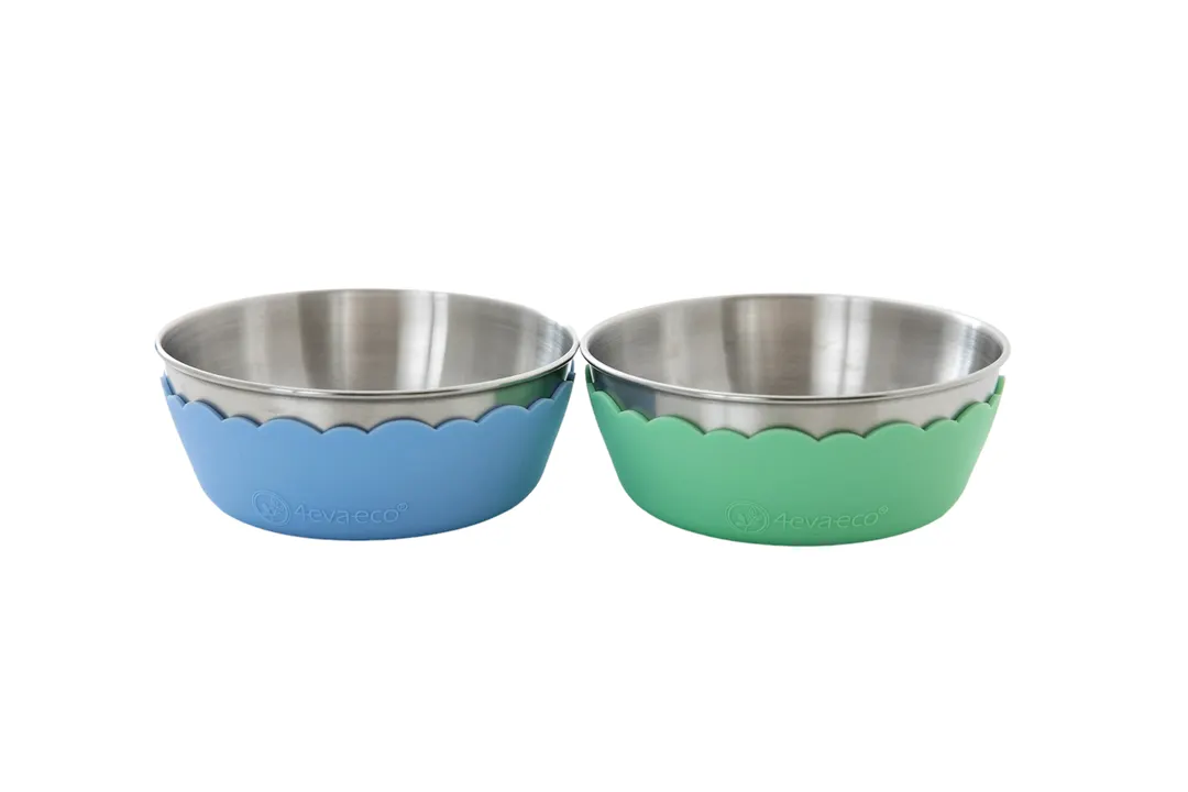 軽くて丈夫、食卓でもアウトドアでも大活躍! 高品質18-8ステンレス(SUS304)と100%食品グレードのシリコンを使用した安全安心なボウル4点セット(ステンレスボウルx2、シリコンボウルx2) ※シリコンボウルの色はお好きな2色をお選びいただけます。 お茶碗サイズでお子様の食事にちょうど良いサイズです。(容量400ml) シリコンボウルはステンレスボウルの滑り止めとして使えるので、テーブルの上で動きにくく、小さなお子さんの自分で食べたい意欲をサポートします。 シリコンボウルを外せば、シンプルでスタイリッシュなステンレスボウルに変身!大人用食器としても使用できます。 また、シリコンボウルはマイナス40℃から230℃まで対応しているので、ケーキやマフィンなどのベーキング型として、ゼリーやムースなどの冷たいデザートの型としても使用可能です。 食洗器使用可。冷蔵&冷凍OK。電子レンジ使用不可。 ピクニックやキャンプにも持ち運びしやすいフォーエバーエコオリジナルコットンバッグ付き。 【サイズ】 直径: 13cm 高さ: 5cm 容量: 400ml ************************************************ ※ 簡易包装へのご協力のお願い 弊社ではお届けに発生する不要物の削減や、環境負荷を抑制するために簡易包装を実施しております。 リユース素材(新聞紙等)を包装紙や緩衝材代わりに使うことで、プラスチック包装やプチプチの使用を控えています。 美しい地球を守るため、過剰包装の廃止、省資源化、ゴミの削減にご理解とご協力をお願い致します。