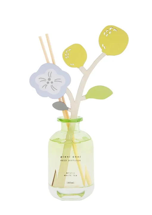 “pieni onni(ピエニオンニ)”=フィンランド語で「小さな幸せ」 北欧をイメージさせるデザインと、心地よい香りで日常にいつも小さな幸せを感じていただけるよう願いを込めたリードディフューザーです。 付属の瓶にフレグランスを注いでリードをセットすると、吸い上げられたフレグランスが気化することによって室内に香りを拡散させます。 オリジナルデザインの木製リードは草花をモチーフにしており、まるで花瓶に生けられたように、明るくやさしい雰囲気のお部屋を演出します。 それぞれのモチーフをイメージした香りは3種類 ・スイートリネン…石鹸ような清潔感、花の甘さもある香り ・フレッシュレモングラス…爽やかなレモングラスの香り ・ミスティックホワイトティー…人気の紅茶ベースにシトラス系をプラスした香り ふわっと自然に香ってくれるルームフレグランスです。 香りの持続時間は約4週間、お使いいただく場所の環境で多少前後します。