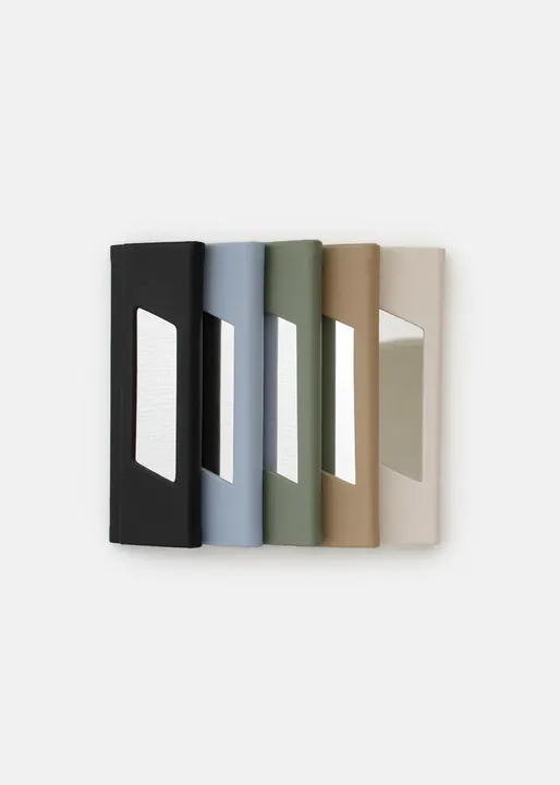 眼鏡やサングラスを掛けている際に、ケース本体を折り畳むことによってコンパクトになるメガネケースで、ポケットにも入るフラットさと軽さが特徴です。また、目元等をちょっと確認したい時に重宝する鏡の小窓付きです。