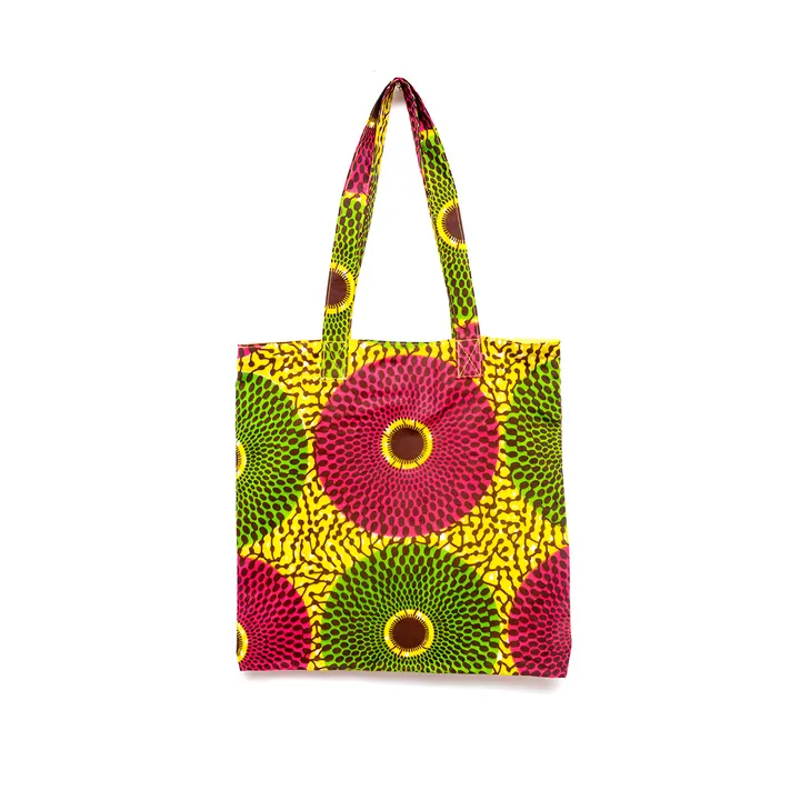 気軽にアフリカンプリントを楽しめる、エコバッグシリーズ。 カラフルなアフリカンプリントを使用し、たっぷりと物が入る正方形のエコバッグです。 内側に4つと外側にチャック付きのポケットがついているので、細かいアイテムの整理整頓もばっちりです。 裏地が付いているので、PCなどの重量感がある持ち物もしっかりと入れられることができ、メインバッグとしてもお使いいただけます。コンパクトに折り畳むこともできるので、もちろんエコバッグとして持ち歩くこともできます。 端を内側に入れてボタンをとめることで、巾着のような形でもお使いいただけます。 コーディネートに合わせてデザインを変えてみてください。 ※在庫に限りがございます。 ※実際の製品と写真とでは、色や柄の出方が異なる場合があります。あらかじめご了承ください。 <お届け時期について> オーダー確認後、最長1週間程度で発送いたします。 <サイズ> W40cm × H40cm <総重量> 約200g <素材> コットン・PV <取扱について> 1. RICCI EVERYDAYの製品は、アフリカンワックスプリントの布を使用しています。製品製作時に布に水を通し、色止め加工を施す等、極力、水による色落ちを防ぐようにしております。但し極度な水濡れや摩擦等により色落ちする可能性がありますので、雨の日の使用はお控えいただき、十分にご注意下さい。 2. アフリカ布の柄によっては、色むらやシミがあることがありますが、こちらは布のプリント時に生じたものですので、予めご了承下さい。 3. 保管の際は、なるべく日の当たらない所に置いてください。日の当たる場所に長時間置いておくと色あせする可能性があります。 4. 過度に重いものは入れないようにご留意下さい。