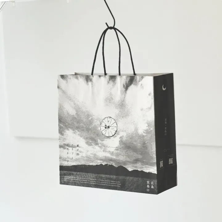 贈答用オリジナル手提げ袋 【袋のみ】 横32cm×縦31cm×マチ10cm ギフトボックスが2箱まで入ります。 厳島をデザインした宮島口ならではの贈答用ショップバッグです。 両横面には厳島神社大鳥居にある「月と太陽」をモチーフに、細かい部分までこだわって作ったバッグです。 仕事関係やお世話になった方への贈答用にいかがでしょうか?