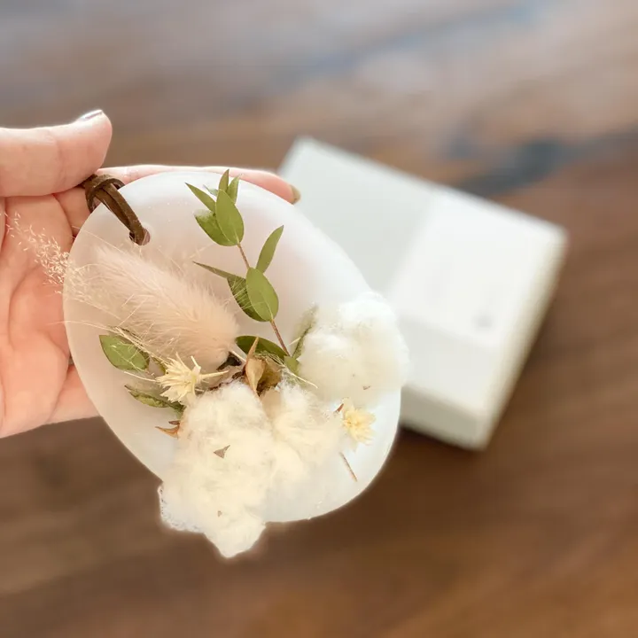 優しげなコットンフラワーのドライフラワーをアロマワックスの中に詰め込みました。 大切な方へのギフトにおすすめです。 ◼︎香りについて フレグランスオイルと天然のアロマオイルを調合したオリジナルの香りをご用意。以下の中からお選びください。 <選べる香り> ①Rosepetal 華やかなローズの香り。植物の香りの奥に深みのある上品な香りが広がり玄関などにぴったりな香りです。 ②Fruity オレンジと近い甘い香り。柑橘系をベースに甘い香りがふんわりと広がります。少女のような元気で優しい印象の香りです。 ③Linen せっけんのような清潔感のある香り。柔軟剤のような清潔感のある香りが広がります。香水のような強い香りが苦手な方にはオススメです。 環境にもよりますが、香りは3ヶ月〜半年ほど持続します。 インテリアの一部やクローゼットなどに置いて香りをお楽しみください。