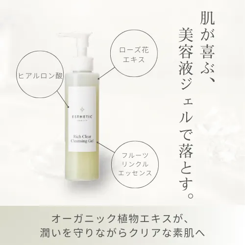 \エステサロン発/ オーガニック×エイジングケア化粧品(業務用&店販兼用) 施術の効果を高め、自宅でもお肌の土台を整える処方。 ❁美容液ジェルでメイクを落とすような潤い感でクリアな素肌へ 20種類の美容成分を贅沢に配合 ❁フルーツリンクルプロテクトエッセンス配合 年齢肌を活力あふれる肌へ導き、肌コンディションを整え、透明感を引き出します。 ※透明感とは艶やかさ、滑らかさを指します。 ❁オイルフリー&エクステ対応 【揺らぎ肌にも優しい8つのフリー処方】 アルコールフリー/パラペンフリー/鉱物油フリー/石油系合成界面活性剤フリー/着色料フリー/香料フリー/シリコンフリー/紫外線吸収剤フリー