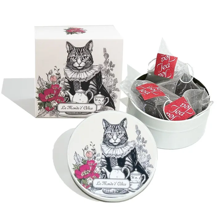 「その一杯が、幸福の扉を開く。──物語を鮮やかに彩る、幸せの鍵(クレ・デュ・ボヌール)。」 【コンセプト】 「幸せの鍵」という名を持つ、Cat Baronシリーズ随一の華やかなブレンド。 クラシックコレクションのミニ缶には、咲き誇る花々に囲まれ、穏やかなティータイムを愉しむ猫の貴婦人が描かれています。 手にするだけで心が弾むような、美しい物語の一幕を閉じ込めました。 【商品の魅力】 ・ 五感で愉しむ幸福感 缶を開けると広がる、甘く優雅な香りと、目にも鮮やかな花びら。  お湯を注ぐ瞬間から、日常がふんわりと幸福な色に染まります。 ・ 贈りたくなる、飾りたくなる  淡いピンクと花々の意匠が施されたミニ缶は、飲み終わった後も特別な「宝物入れ」に。  鏡台やデスクに置くだけで、空間に物語の華やぎを添えてくれます。 ・ 願いを込めたギフトに  「幸せが訪れますように」というメッセージを込めて。  記念日や門出のお祝いなど、大切な方の幸せを願う贈り物にふさわしい重厚感ある一品です。