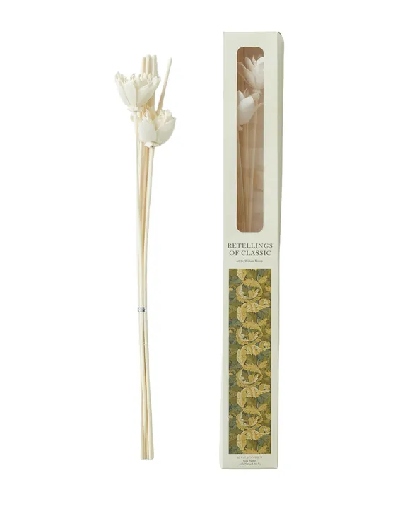 〇RETELLINGS OF CLASSIC リテリングスオブクラシック Art by William Morris 「モダンデザインの父」と呼ばれる「アーツ・アンド・クラフツ運動」の先駆者、ウィリアム・モリスの代表的なボタニカルデザインを用いたフレグランスシリーズ。 【ウィリアム・モリス(William Morris、 1834 年 3 月 24 日 - 1896 年 10 月 3 日)】19 世紀イギリスのテキスタイルデザイナー、詩人、ファンタジー作家、アーティスト(作家)、印刷者、翻訳家、建築保護運動家、社会主義活動家。多方面に関わるアーツ・アンド・クラフツ運動主導者。彼の残した名言で、「役に立たないものや、美しいとは思わないものを、家に置いてはならない」があります。 ▶ウィリアム・モリスのデザインモチーフを用いたリテリングスオブクラシックは、細部までこだわったフレグランスアイテムと厳選された香りが創り出す世界観で、上質なライフスタイルへと誘います。 ▶フレグランスは不快な臭いの原因成分を化学反応、水素結合、ファンデルワールス結合により、違う成分へ変化させることを目的とした消臭機能を兼ね備えています 〇Solaflower & Natural Sticks ソラフラワーナチュラルスティック 別売りのリキッドボトルに挿してご使用いただけます。スティック5本とミニソラフラワー付きスティック 2 本入り。 <フレグランス・デザインの種類> 〇デザイン:STRAWBERRY THIEF 不動の人気柄「イチゴドロボウ」。モリスが夏の別荘“ケルムスコット・マナー”の家庭菜園でイチゴを育てていたところ、食いしん坊の鳥たちにそれを盗られてしまった様子を描いた柄です。 〇デザイン:JASMINE 1872 年頃のウィリアム・モリスのデザインです。花を付けたサンザシとその葉のデザインで一面覆われた背景の上に、くねくねと曲がったジャスミンがあしらわれています。 〇デザイン:HONEYSUCKLE 1883 年にモリスの末娘であるメイ・モリスによって壁紙としてデザインされたもの。力強く生長するスイカズラが優しいイメージで描かれています。 〇デザイン:ACANTHUS 1875 年に発表されたウィリアム・モリスのアイコン的な傑作のひとつで、大柄モチーフの壁紙をデザインし始めた頃の作品です。