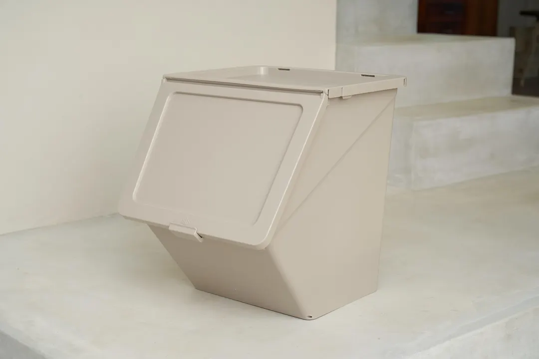 高い機能性とデザイン性、ゴミ箱としての進化 ちょうどいい位置でピタッと止まるフタはそのままに、ゴミ箱として最適な技術とアイディアを組み込みました。 工夫に工夫を重ねた"ひさし"のようなフチは、臭いを防ぐ役割と、開閉音をおさえる静音設計、 さらに水が中に入らないように防ぐ3つの機能が要。 45Lのゴミ袋に対応しているので、大きなゴミや量の多いゴミなど、一気にガバッと捨てられます。 普段のゴミで汚れてしまっても、水で簡単丸洗い。 カチッと止まるロックシステムで、子ども達の手の届く場所に置いても安心です。 下段の前面に取り付けられるプロップは、ゴミの出し入れで前倒しになるのをブロック。 使わない時はネスティングで省スペース保管。 お部屋のアクセントになるカラーと、こだわりの落ち着いた穏やかなモノトーンで 見せたくないゴミ箱を見せたくなるゴミ箱へ。