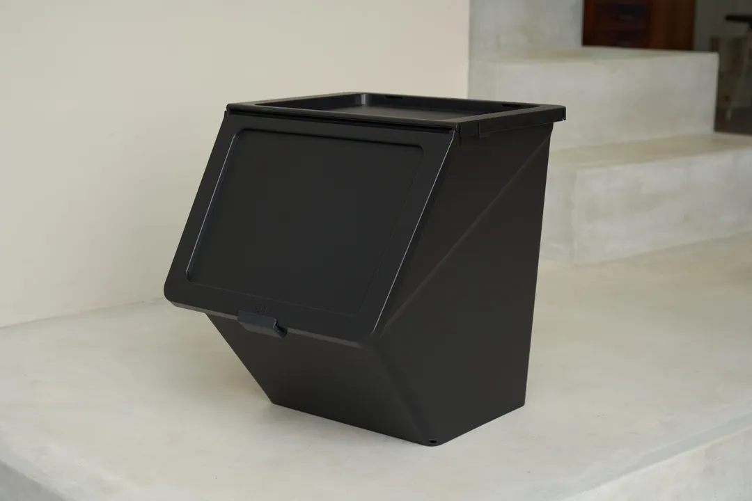 高い機能性とデザイン性、ゴミ箱としての進化 ちょうどいい位置でピタッと止まるフタはそのままに、ゴミ箱として最適な技術とアイディアを組み込みました。 工夫に工夫を重ねた"ひさし"のようなフチは、臭いを防ぐ役割と、開閉音をおさえる静音設計、 さらに水が中に入らないように防ぐ3つの機能が要。 45Lのゴミ袋に対応しているので、大きなゴミや量の多いゴミなど、一気にガバッと捨てられます。 普段のゴミで汚れてしまっても、水で簡単丸洗い。 カチッと止まるロックシステムで、子ども達の手の届く場所に置いても安心です。 下段の前面に取り付けられるプロップは、ゴミの出し入れで前倒しになるのをブロック。 使わない時はネスティングで省スペース保管。 お部屋のアクセントになるカラーと、こだわりの落ち着いた穏やかなモノトーンで 見せたくないゴミ箱を見せたくなるゴミ箱へ。