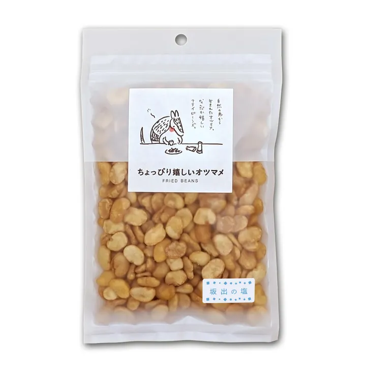 皮なし小粒のそら豆をこめ油で揚げて、坂出の塩で味付けしたフライビーンズです。保存に便利なチャック付き袋です。