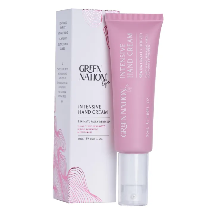 【 インテンシブハンドクリーム 50ml】 ■オーストラリア固有の植物成分が手肌に芳醇な香りと潤いを届けるハンドクリーム 天然由来成分を98%配合したみずみずしいクリームは、保湿力の高い保湿力の高い「ホホバオイル」や「シアバター」をはじめ、 古来よりオーストラリア先住民のアボリジニに食されてきたビタミンCがたっぷりのパワーフード「デザートライム ※1(シトラスグラウカ果実エキス)」、 オーストラリア固有の植物「バンクシアセラタ花エキス ※2」も配合されているので、植物のうるおいを与え手肌を健やかに保ちます。 ※1:デザートライム オーストラリアの乾燥地帯で見られるミカン科の植物で「ビタミン、ミネラル」が豊富に含まれています。 ※2:バンクシアセラタ花エキス ヤマモガシ科のオーストラリア固有の樹木。肌にうるおいを与え、保護します。 ■豊富な植物由来美容エキス配合 10種類以上のたっぷりの美容エキスで、就寝前の美容ハンドクリームとしてもオススメです。 また、抗炎症の観点から200種類以上の植物から厳選された7種類の植物由来美容エキス「MulitiEx BSASM(マルチイーエックス ビーエスエーエスエム)※3」が配合され 重篤な敏感肌の方でも安心してご使用いただけます。 ※3 : MulitiEx BSASM(マルチイーエックス ビーエスエーエスエム) 200種類もの植物から厳選された抗炎症ハーブのスペシャルブレンド。 厳選された7種類のハーブエキスの相乗効果で抗炎症作用を発揮します。 【MulitiEx BSASM配合成分】 ・ カモミール ・イタドリ ・チャ樹 ・ツボクサ ・コガネバナ ・ローズマリー ・スペイン甘草 ■ベタつかないテクスチャー 手に出した時の触り心地にこだわり、何十回ものテストを行いたどり着いたこだわりのテクスチャー。 しっとり潤いながらもサラリとした仕上がりで、塗布後にスマートフォンやキーボードに触れてもべたつきを感じません。 ■エアレスポンプで香りと成分をフレッシュに。 通常はスキンケア製品に使用されるエアレスポンプを採用。 チューブ内へ空気が入るのを防止して、「クリームを酸化させず最後まで」衛生的にご使用いただけます。 毎回適切な量がプッシュされるので、クリームの出すぎによる使いすぎの防止にも。 ■五感を呼び起こす豊かな自然の香り 厳選したエッセンシャルオイルでオリジナルブレンドされた贅沢な自然の香り。 とにかく「心地よい」と感じる香りを目指して、何層にも重なるエッセンシャルオイルの奥深く美しいブレンドを完成させました。 【香り(2種類)】 ■ スイートオレンジ&レモングラスの香り スイートオレンジ / マンダリン / ジンジャー / スターアニス / レモングラス さっぱり爽やかな柑橘類の香りの中にほのかな甘さのフルーツミックスと暖かいアロマノートが絶妙なバランスが取れた香りです。 ■ラベンダー&タイムの香り サンダルウッド / ペパーミント / ラベンダー / タイム / クラリセージ ラベンダーの爽やかなハーバルの香りと優雅なハーブの香りがするタイムのブレンドは 気分をフレッシュにしてくれながらも落ち着く心地よい香りです。 ■ベルガモット&イランイランの香り イランイラン / ベルガモット / ネロリ / ローズウッド / プチグレン マイルドでスパイシーなフローラルブレンドの中にオレンジがほのかに香ります。 【GREEN NATION life ブランド紹介】 エココンシャスなオーストラリアの日用品業界で25年以上キャリアを積んだ2人の女性, Fiona(フィオナ)とAlanna(アランナ)が「自分たちで本当に使いたいものを自分たちの手で」をコンセプトに、 厳選した最高級の天然由来成分で、人に環境に優しいホームケア&エアケアアイテムをオーストラリアのメルボルンから届けています。