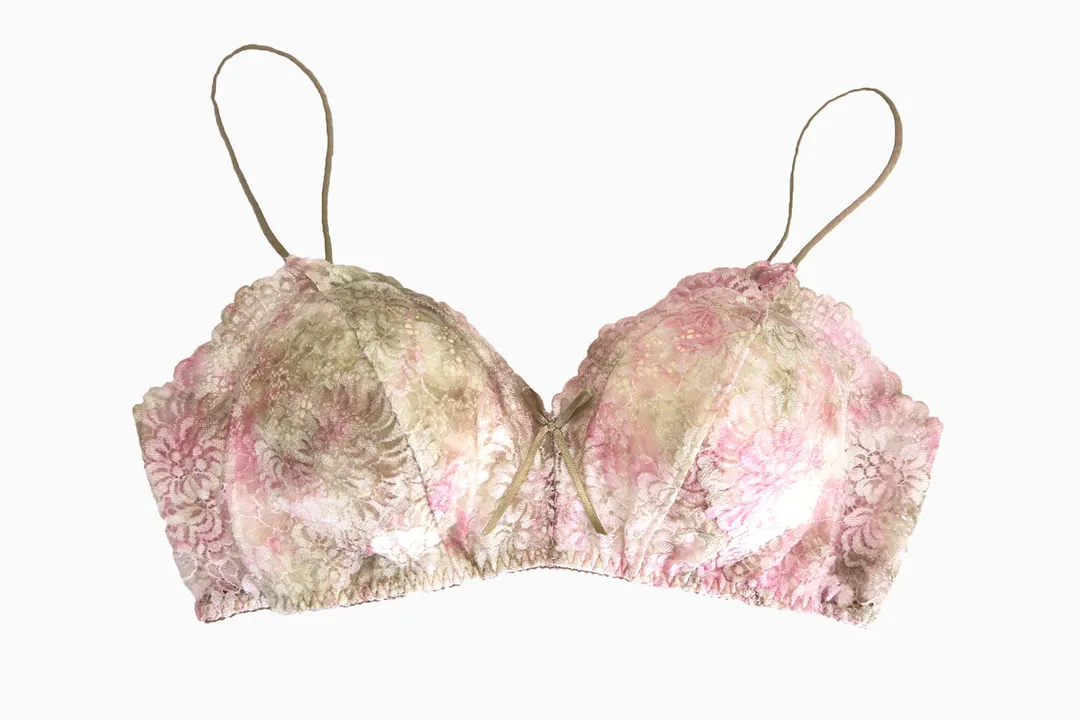 ノンワイヤーブラです。 工芸染でストレッチレースを染ました。手染めの為1点1点お色の出方が変わります。その為世界で1点だけの物となります。 普段使いはもちろん、ゆっくり家で過ごす日や就寝時にもストレスなくお使い頂けます。 別売りでお揃いの、ショーツ、タンガ、がございます。  サイズM(A70-D70,A75-C75に対応します。)