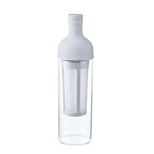コーヒー粉と水だけでアイスコーヒーが作れます。ストレーナーにコーヒー粉を入れ、フタをして注ぎ口にセットしたら少量ずつ水を注ぎます。水を注ぎ終えたら栓をして、ボトルをゆっくり左右に振って抽出を促します。冷蔵庫で8時間程抽出してできあがりです。