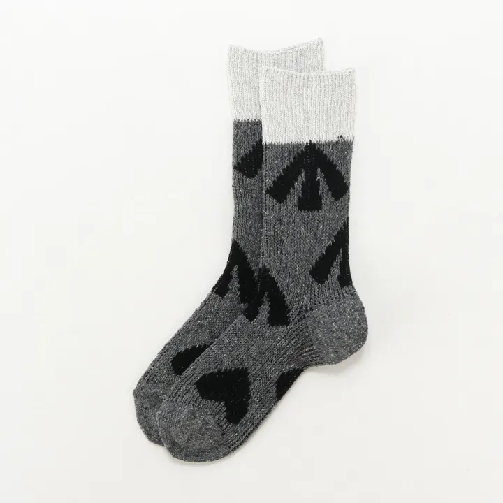 イギリス政府の所有物を表すマーク、Broad Arrow(ブロードアロー)。 矢はイギリス軍の重要な武器として位置付けられており、矢じりから様式化されることで完成したマークです。 今では様々なブランドのモチーフとして使用される例があります。 1600年代後半から使用されるようになり、1920年代までは囚人服にも用いられていました。 参政権を求めるために活動を続けたサフラジェットたち。 人々の共感を得るために行動をした彼女たちは、醜悪で劣悪な環境である刑務所に収監され、いのちをかけて戦いました。 まだ100年ほどしかたっていない最近の話です。 彼女たちをリスペクトして完成した靴下です。 SILK92%,POLYESTER6%,POLYURETHANE2% 日本製