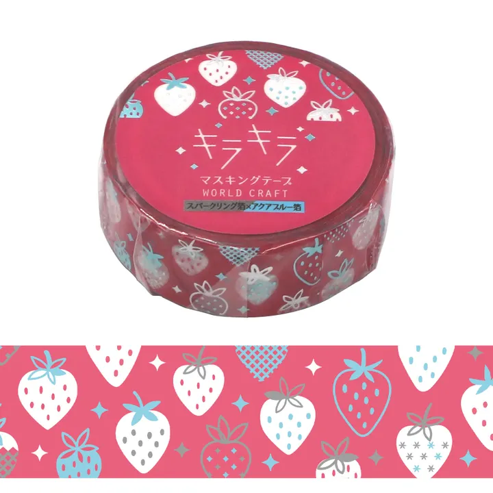 【 キラキラマスキングテープ 15mm Strawberry】  ★★ 箔を使用した、キラキラが可愛いキラキラマスキングテープ 〜 第4弾  Aqua,Decoration、Fruits の3つをテーマに <12柄> を揃えました ★★ 思わず目をキラキラさせてしまうぐらいフレッシュなかがやくいちごに一目ぼれ!? み〜んなだいすきないちごがいっぱいのデザインです♪ 『スパークリング箔とアクアブルー箔』 を使用しています♪