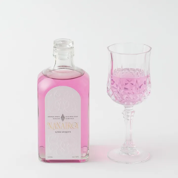 花咲くアロマ――。 ロゼワイン酵母のNewスピリッツ 本格焼酎製法でつくられたスピリッツ「NANAIRO-七色-」。 ロゼワイン酵母で仕込んだ原酒が、紫芋の天然色素で鮮やかなピンクに色づきました。 フローラルで華やかな香りと、フルーティーな味わいが特長。瓶ごと冷凍庫に入れて冷やして飲むパーシャルショット、 ソーダ割、ロックなど、飲み方を変えて、味わいや香りの変化をお楽しみください。 NANAIROは、香りを重視した商品を考えてサンプルの試行錯誤を重ねる中で生まれました。 原料に使用している芋は、さつまいもの品種「コナイシン」。機械が壊れてしまうほど固い繊維質で仕込みに3倍の手間がかかるなど、焼酎の原料としては扱いづらく、これまでほとんどの蔵元で使用されることはありませんでした。ですが農家や蔵元が悩まされている基腐病に強いことから、若潮酒造ではコナイシンを使用した商品開発にチャレンジしてきました。杜氏の経験から、ロゼワイン酵母の減圧蒸留でつくる本格焼酎は、香り高くフルーティーな味わいになるとの期待があり、これまでになかった花のような香りと甘みのある味わいを引き出すことができました。