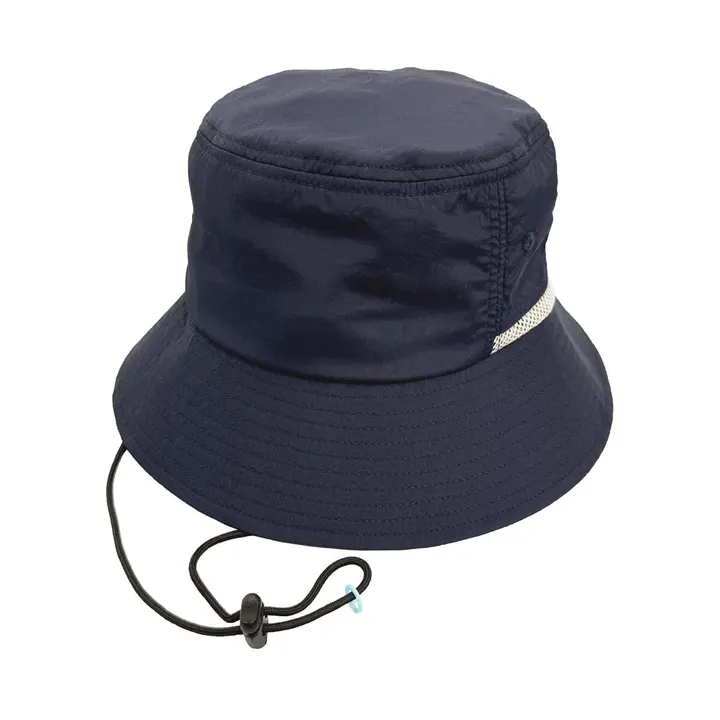 ナイロン素材の顎紐付きハット。通気性の良いベンチレーション仕様。裏地はメッシュ素材、顎紐は取り外し可能。軽量、吸水速乾、撥水、UVケア、接触冷感、通気性と多機能を兼ね合わせています。