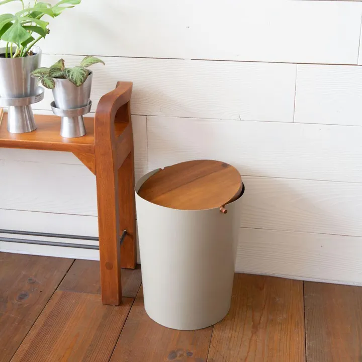 ガルバナイズ(亜鉛メッキ鋼板)に塗装を施した本体に、やさしい木の回転蓋を組み合わせたダストボックス。中身が見えない構造で、空間に溶け込むように生活感を包み込みます。袋をしっかり固定できる内側リング付きで、見た目だけでなく使いやすさにも配慮しました。カラーはインテリアになじみやすい2色展開で、ゴミ箱であることを忘れるような、佇まいの美しい日用品です。 鉄板の表面に亜鉛メッキ加工を施した素材のガルバナイズ。鉄の強さと亜鉛の防サビ効果を兼ね備えています。