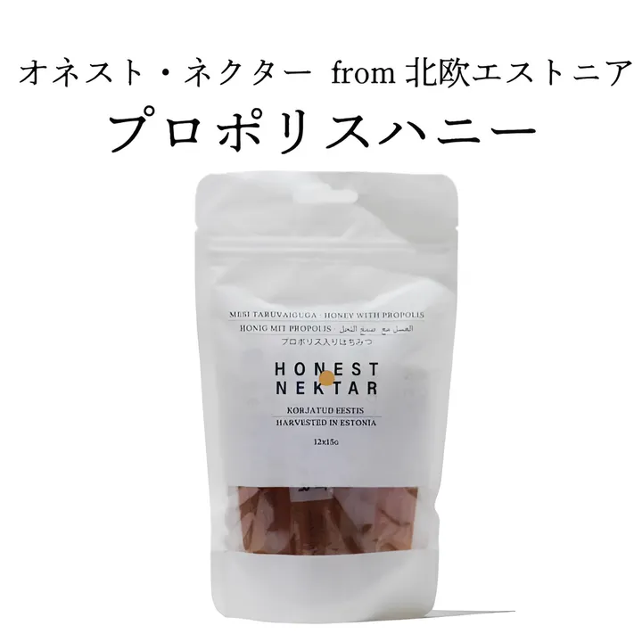 北欧・エストニアの豊かな自然と透き通った空気のもとうまれた栄養たっぷりのこだわりはちみつ。 ひとつの養蜂木箱から少量しか取れない希少なプロポリスをはちみつにブレンドしたスティックタイプ。喉や体調の管理に毎日定期的にお使いいただけるよう1袋あたり6gの分包タイプに仕上げました。 【内容量】 180g(6g×30本) 【原材料】 はちみつ、プロポリス(3%) 【賞味期限】 製造より20か月 【JANコード】 4518568021543
