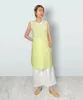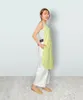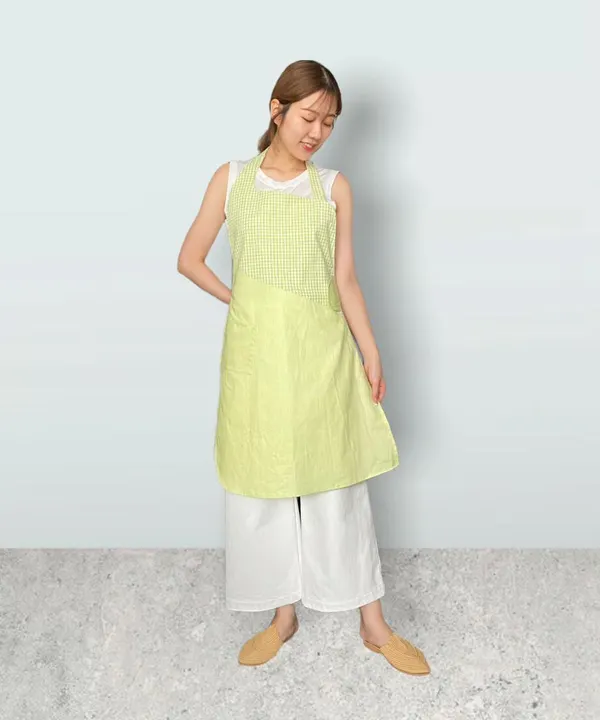 胸元に フランスコットン ライムグリーンギンガムチェック。 スカート部分にライムグリーンのコットンを合わせたコンビエプロン ライムグリーンのギンガムチェックと同じ色のやや薄手のコットンをスカート部分にあわせました。 色がピッタリすぎて一枚の布のようです。 カーブを大胆に用いた構築的デザインは斬新ですが、身に着けてみると、驚くほどフィットします。 前身頃だけの分量なので、軽く、ウエストベルトでしっかり腰を固定させれば、首への負担も軽減できます。 プレゼントとして一押し! ポケット: 右ポケット ウエスト: ゴムとベルトを合わせて 面ファスナー(マジックテープ)で留めるタイプ 肩ひも: ゴムとベルトを合わせて 面ファスナー(マジックテープ)で留めるタイプ