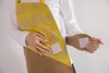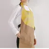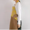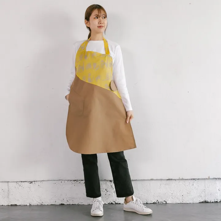 胸元に 六本木「NUNO」ねこの刺繍  スカート部分にダークネイビーを合わせたコンビエプロン 風合いの違う生地を合わせたコンビエプロンは、組み合わせが楽しい一枚です 六本木「NUNO」ねこは、優しい黄色の薄い生地にねこの刺繍が施されています 巷に かわいいねこはあふれているけれど、こちらのねこは怒ったり驚いたり振り向いたりが糸で表情されていてユーモラス! よく見ると どのねこも動き出しそう! スカート部分に無地を合わせることで、「NUNO」の美しさが引き立ちます カーブを大胆に用いた構築的デザインは斬新ですが、身に着けてみると、驚くほどフィットします
