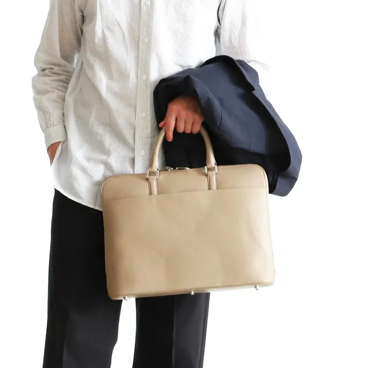 【 ビジネスが加速するレザーバッグ 】 「より良い仕事ができるために」 あなたの能力を最大限に発揮するために、私たちは何ができるか?そんな思いから開発したビジネスレザーバッグです。 あなたの仕事をアシストするような使い勝手を追求して、 「薄い」「自立する」「ガバッと大きく開く」 この3点にフォーカスして実現しました。 バッグの側面まで配したラウンドファスナーにより、ガバッと大きく開くため、目当てのものがスマートに取り出せます。 内側にはポケットが合計3つ、クッションを施したPCスペースが1つ、さらに外側にもスマートフォンなどの小物を収納できるアウトポケットも採用。 これだけ収納できて厚みはわずか8cm。 【 ストレスゼロの使い心地 】 通勤やオフィス間の移動時でも、軽快で取り回しが良いのでストレスフリーです。また、とっさの電話などで床に置いても自立するように設計しました。 (バッグ内の荷物が偏るとたおれる可能性があります) ダブルファスナー仕様で右利きの方だけでなく左利きの方でも安心です。 また、バッグの裏地は明るい色調の生地により、内容物が見やすく探しやすいです。キャリーケースバーを差し込んで固定できるベルトを装備していますので、キャリーケースの上に乗せることができて、そのまま移動してもバッグが落ちることはありません。 【 選び抜いたプレミアムレザー 】 「お客様、バングラデシュの職人、環境を守る」 この想いから素材選びには徹底的にこだわりました。 クロム鞣し革は大量生産でき生産も早いですが、大量の薬品を使うため、環境汚染や革職人に悪影響を及ぼします。 その反面、植物タンニン鞣し革は生産に2ヶ月以上かかりますが、環境負荷が少なく耐久性にも優れています。 本製品では、この植物タンニン鞣しのプレミアムレザーを採用しており、長くお使いいただけると同時に、使うほどに肌になじみ植物タンニン鞣しならではの独特な風合いをお楽しみいただけます。