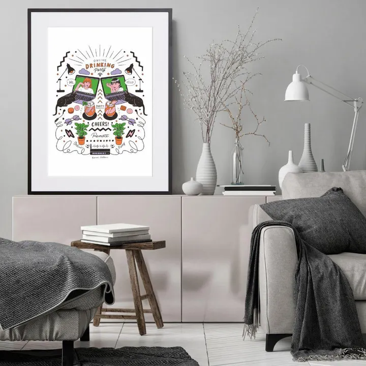 アーティスト -PROFILE- Satomi Kawai(サトミ カワイ) イラストレーター&グラフィックデザイナー 女子美術大学デザイン学科卒業 デザイン会社での勤務経て2015年フリーランスに。 ちょっとシュールで小洒落たイラストを描いています。 【作品について】 コロナ禍で当たり前になったオンライン飲み会 その楽しさをアートに閉じ込めました! おしゃれでポップな現代アート 作品名:online drinking party 手法:イラスト、デジタル ペーパー:高品質半光沢紙 マットカラー:白 マット*:DXホワイト芯 100%バージンパルプ/PH7・中性紙(2mm厚) ※全てのアートにマットがつきます フレームカラー:黒、白、無垢(3種類から選択) ※マット付のため通常とはフレームサイズが異なる規格となります。 【マット*とは?】 アートポスターの周りに挟んだ厚紙の事。 マットを使わない時に比べ余白により広がりが生まれ、作品の新たな一面を引き出せ作品の見栄えがグッと良くなります。また、額縁のガラス面と作品が直接触れたままにしておくと、くっついて作品を傷つけることがあります。マットを使用することでガラスと作品の間に空間ができ、作品を保護することができます。ブランドコンセプトにより全てのアートにマットがつきます。 ー ファッションのようにアートを ー 私達が掲げるコンセプトです! 毎日着替えるファッションの様に、アートも気軽に飾り変えて欲しい... 一旦飾り終えたアートにも光を当ててほしい... ポスター単体、またはリピートで中身だけのポスターを購入された方に"専用のハンガー"をセットでお届け。 「今までに無い!新しいアートの飾り方を提案」 飾る事がなくなった前のアートをハンガーにかけて洋服と一緒にかけてもらう。 その日の気分や、モチベーションですぐに取り換えられる様に。 もちろん、魅せる収納としても今までにないおすすめの飾り方です。