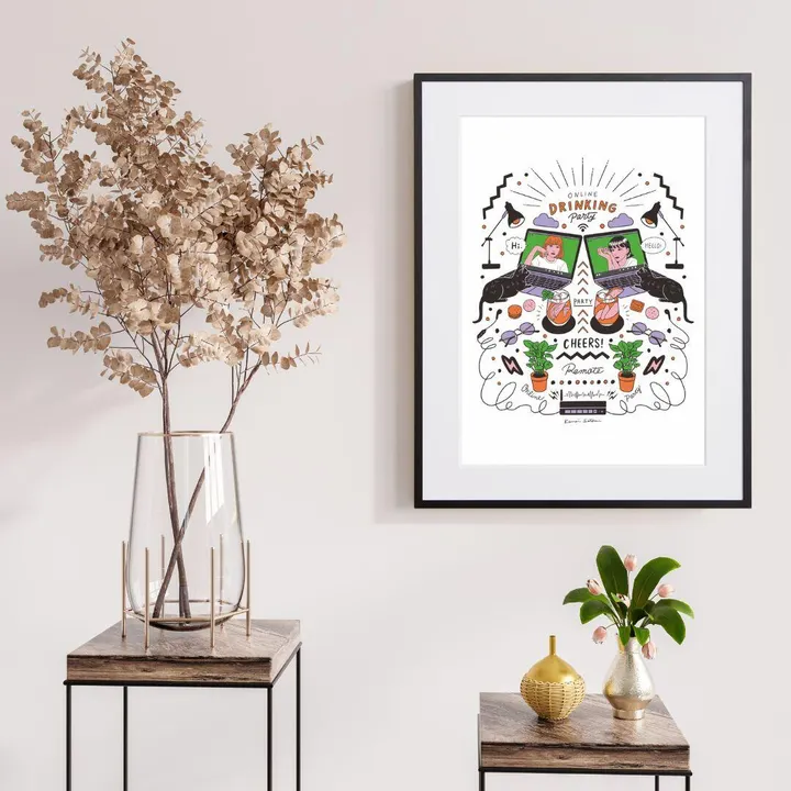 アーティスト -PROFILE- Satomi Kawai(サトミ カワイ) イラストレーター&グラフィックデザイナー 女子美術大学デザイン学科卒業 デザイン会社での勤務経て2015年フリーランスに。 ちょっとシュールで小洒落たイラストを描いています。 【作品について】 コロナ禍で当たり前になったオンライン飲み会 その楽しさをアートに閉じ込めました! おしゃれでポップな現代アート 作品名:online drinking party 手法:イラスト、デジタル ペーパー:高品質半光沢紙 マットカラー:白 マット*:DXホワイト芯 100%バージンパルプ/PH7・中性紙(2mm厚) ※全てのアートにマットがつきます フレームカラー:黒、白、無垢(3種類から選択) ※マット付のため通常とはフレームサイズが異なる規格となります。 【マット*とは?】 アートポスターの周りに挟んだ厚紙の事。 マットを使わない時に比べ余白により広がりが生まれ、作品の新たな一面を引き出せ作品の見栄えがグッと良くなります。また、額縁のガラス面と作品が直接触れたままにしておくと、くっついて作品を傷つけることがあります。マットを使用することでガラスと作品の間に空間ができ、作品を保護することができます。ブランドコンセプトにより全てのアートにマットがつきます。 ー ファッションのようにアートを ー 私達が掲げるコンセプトです! 毎日着替えるファッションの様に、アートも気軽に飾り変えて欲しい... 一旦飾り終えたアートにも光を当ててほしい... ポスター単体、またはリピートで中身だけのポスターを購入された方に"専用のハンガー"をセットでお届け。 「今までに無い!新しいアートの飾り方を提案」 飾る事がなくなった前のアートをハンガーにかけて洋服と一緒にかけてもらう。 その日の気分や、モチベーションですぐに取り換えられる様に。 もちろん、魅せる収納としても今までにないおすすめの飾り方です。