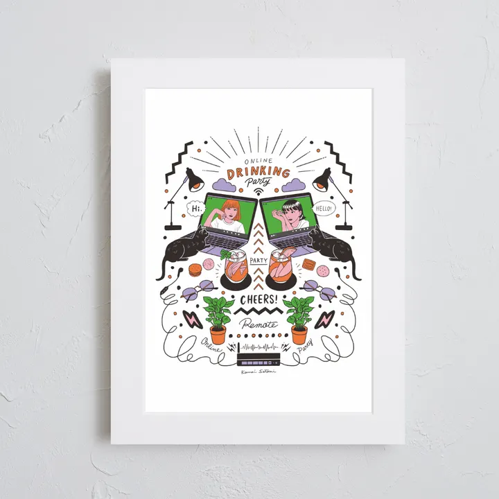 アーティスト -PROFILE- Satomi Kawai(サトミ カワイ) イラストレーター&グラフィックデザイナー 女子美術大学デザイン学科卒業 デザイン会社での勤務経て2015年フリーランスに。 ちょっとシュールで小洒落たイラストを描いています。 【作品について】 コロナ禍で当たり前になったオンライン飲み会 その楽しさをアートに閉じ込めました! おしゃれでポップな現代アート 作品名:online drinking party 手法:イラスト、デジタル ペーパー:高品質半光沢紙 マットカラー:白 マット*:DXホワイト芯 100%バージンパルプ/PH7・中性紙(2mm厚) ※全てのアートにマットがつきます フレームカラー:黒、白、無垢(3種類から選択) ※マット付のため通常とはフレームサイズが異なる規格となります。 【マット*とは?】 アートポスターの周りに挟んだ厚紙の事。 マットを使わない時に比べ余白により広がりが生まれ、作品の新たな一面を引き出せ作品の見栄えがグッと良くなります。また、額縁のガラス面と作品が直接触れたままにしておくと、くっついて作品を傷つけることがあります。マットを使用することでガラスと作品の間に空間ができ、作品を保護することができます。ブランドコンセプトにより全てのアートにマットがつきます。 ー ファッションのようにアートを ー 私達が掲げるコンセプトです! 毎日着替えるファッションの様に、アートも気軽に飾り変えて欲しい... 一旦飾り終えたアートにも光を当ててほしい... ポスター単体、またはリピートで中身だけのポスターを購入された方に"専用のハンガー"をセットでお届け。 「今までに無い!新しいアートの飾り方を提案」 飾る事がなくなった前のアートをハンガーにかけて洋服と一緒にかけてもらう。 その日の気分や、モチベーションですぐに取り換えられる様に。 もちろん、魅せる収納としても今までにないおすすめの飾り方です。