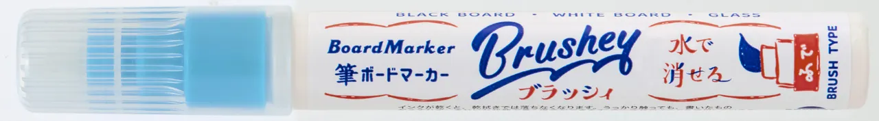 柔らかくしなる筆芯でしなやかな筆文字が書けるボードマーカーです。 筆タイプなのでとめ、はね、はらいが表現できて文字や線の太さを自由に変えられます。 ブラックボード、ホワイトボード、ガラス、アクリルなどに筆記可能で退色しにくい顔料インクなので長期間の展示でも鮮やかな発色をキレイに保ちます。 柔らかい布やティッシュに水を含ませて水拭きするだけで簡単に消字可能です。 完全に乾いた状態であれば少しの雨でもインクが流れ落ちることはありません。