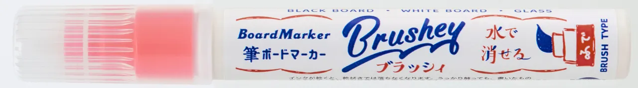 柔らかくしなる筆芯でしなやかな筆文字が書けるボードマーカーです。 筆タイプなのでとめ、はね、はらいが表現できて文字や線の太さを自由に変えられます。 ブラックボード、ホワイトボード、ガラス、アクリルなどに筆記可能で退色しにくい顔料インクなので長期間の展示でも鮮やかな発色をキレイに保ちます。 柔らかい布やティッシュに水を含ませて水拭きするだけで簡単に消字可能です。 完全に乾いた状態であれば少しの雨でもインクが流れ落ちることはありません。