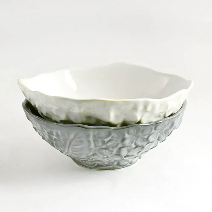 花びらのにぎわいを器の側面やふちに彫刻風に施し 立体的な花びらの凹凸を、釉薬の流れる濃淡で表現、土の風合いも出しています。 料理を盛る面は、凹凸模様が無いので使いやすく、テーブルにも映え、シンプルな色でありながら、やさしく花を咲かせます。こちらのライスボウルは茶碗としてはもちろん、小ぶりなスープ・サラダボウルとしてお使いいただいても様になります。