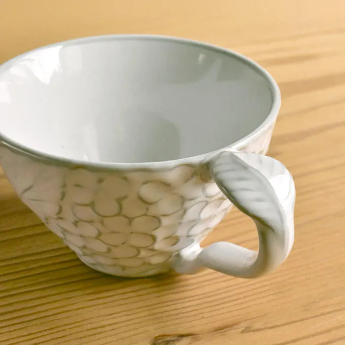 花びらのにぎわいを器の側面やふちに彫刻風に施し 立体的な花びらの凹凸を、釉薬の流れる濃淡で表現、土の風合いも出しています。 料理を盛る面は、凹凸模様が無いので使いやすく、テーブルにも映え、シンプルな色でありながら、やさしく花を咲かせます。こちらのライスボウルは茶碗としてはもちろん、小ぶりなスープ・サラダボウルとしてお使いいただいても様になります。