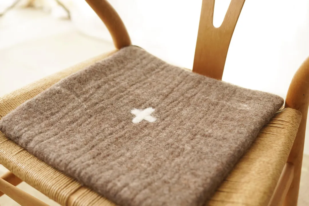 人の手で作られたフェルトは空気をたくさん含んで、とても温かく、クッション性もあり、チェアーパッドに最適です。 中までしっかりとウールなので、へたって来ることもなく長くお使いいただけます。 北欧風のシンプルなデザインなので、どんな椅子にも合わせやすく、あたたかい雰囲気にしてくれます。 ワイチェアー(Yチェアー)などのペーパーコードの椅子にもピッタリです。 手仕事でひとつひとつ作られたチェアーパッド、使ってぜひその良さを実感してください。 ライトグレーに白いプラス、ダークグレーに黒いプラス、茶色時に白のプラスの3種類のデザインです。 裏側は無地で角にアンダイドプラスのロゴの入った本革のタグが付いています。