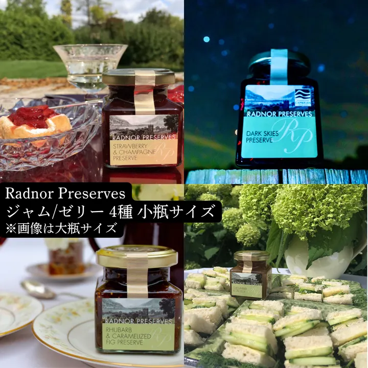 【サンプル】 Radnor Preservesで人気のジャム/ゼリー4種を集めました。 サイズは小瓶サイズ(44〜45g)になります。 それぞれ、個性あるジャム、ゼリーの味わいをお試しください。 ラドノープリザーブはラグジュアリーマーマレードやハンドメイドジャム、至高のチャツネを最高品質の天然素材を使いハンドカットによる丁寧な工程で作り続けるアルチザンブランドです。ウェールズの山岳地帯に工房を構え、数々のアワードを受賞するマーマレードの幅広いラインナップとともに、英国ウェールズの伝統文化を現代的に解釈する新しい商品づくりにも取り組んでいます。 ■Radnor Preserves ジャム/ゼリー 4種 (原産国:全て英国ウェールズ) ①ストロベリーシャンパンプリザーブ イギリスの夏の代表的スイーツいちごをシャンパーニュに漬けてシロップにしています。スコーンやクロテッドクリームと合わせると、アフタヌーンティーにぴったりなのは言うまでもありません。 名称:イチゴジャム 原材料名:イチゴ 、砂糖、レモン果汁、シャンパン 内容量:44g 賞味期限:2027 年1月 栄養成分表示(100g当たり) 熱量:256kcal 蛋白質: 0.4g / 脂質:0g / 炭水化物:63g / 食塩相当量:0.01g ②ダークスカイ プリザーブ ウェールズ中部の星が輝く程美しい暗い空を讃えています。チャックルベリー (ブラックカラント、グーズベリー、レッドカラントの交配種) からこの程よい酸味のジャムが生まれます。材料であるウェールズ産のジンに入っている銀粉は、銀河の星がちりばめられた星雲を映し出しているような美しさです。 名称:チャックルベリージャム 原材料名 :チャックルベリー、砂糖、レモン汁、ジン(マダムジュネヴァシル バーリーフジン) 内容量:45g 賞味期限:2027年1月 栄養成分表示(100g当たり) 熱量:223kcal 蛋白質: 0.5g / 脂質:0g / 炭水化物:57g / 食塩相当量:0.01g ③ルバーブ&キャラメライズド フィグ プリザーブ ルバーブとイチジクという素晴らしい組み合わせで、甘いもの、塩味の料理に合わせても楽しめます。朝食やお茶にもよく合いますが、上品なオーツビスケットの上に⻘かび系のチーズを乗せ、その上にチーズと同じくらいたっぷり乗せてお試しください。 名称:ミックスジャム 原材料名:果実(ルバーブ、イチジク)、砂糖、レモン汁 内容量:44g 賞味期限:2027年1月 栄養成分表示(100g当たり) 熱量:268kcal 蛋 0.03g / 脂質:0g / 炭水化物:67g / 食塩相当量:1.0g ④キューカンバー&ディルゼリー 胡瓜とディルを使う爽やかな甘みのゼリー。子供たちには理解できないかもしれませんが、この香り豊かなゼリーはスモークサーモンにぴったりです。 名称:ゼリー 原材料名:リンゴ、キュウリ 、レモン、砂糖、サイダービネガー、ディル 内容量:44g 賞味期限:2027年1月 栄養成分表示(100g当たり) 熱量:223kcal 蛋白質: 1.1g / 脂質:0g / 炭水化物:54g / 食塩相当量:0.02g