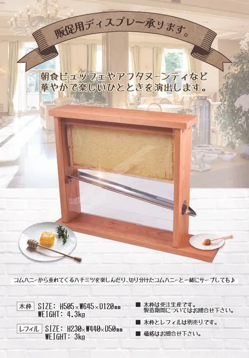 大型コムハニーを木枠ごと中に入れて展示できる商品となります。 アクリルを外して、お客様の前で直接切り分けも可能です! ホテルのビュッフェやカフェ、飲食店でのご利用が多く、インパクト大な商品です。 木枠のみのお買い上げはご遠慮いただいておりますので、大型コムハニーとご一緒にご注文ください。 ************************************** #コムハニー業務用 #カフェ #ビュッフェ #クリスマス #バレンタイン #パーティ #アフタヌーンティ #ディスプレー