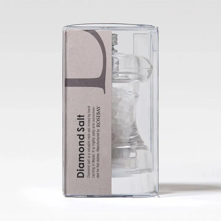 天然食用岩塩を挽くためのミルにダイアモンドソルトが入った商品。 ダイヤモンドソルトは7種類の天然ミネラルを含んだ真っ白な岩塩。さっぱりとしていて、精製塩のような苦辛さがまったくありません。もちろん採掘して粉砕しただけの無漂白100%天然ですので安心してお使いいただけます。どんな料理にも相性が良いので、普段使いでいろいろとお試し下さい。 ご使用方法 こちらの商品はヒマラヤ岩塩(ダイアモンドソルト 粒状2mm-5mm角)入りですので、そのまま挽いてお料理にかけるなどしてお使い下さい。 風味の強さ 弱 相性の良い料理 食材全般 ミネラル成分 ナトリウム カルシウム 鉄 リン マグネシウム カリウム 塩素