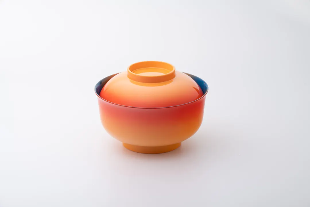 石川県加賀市の加佐の岬から見た夕日をモチーフにした蓋付の大きめのお椀。外側は夕日の強弱を表す橙のグラデーション、内側は海岸に沈み夕日を幻想的な変わり塗りです。内外の対照的な色彩で「侘び寂び」を感じることができます。蓋は皿としても使え、お椀は麺類やお雑煮の椀やアイスクリームも入れるデザートしても良いです。食洗器、電子レンジ対応のプラスチック素地に職人が一つ一つ吹付塗装で塗り重ねられ、蓋を開けると鮮やかな色彩が広がります。