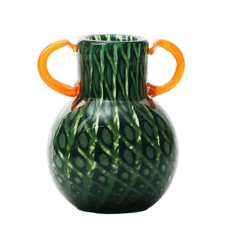 繊細なガラスで仕立てられたフラワーベース。 六角形や菱形の模様が光を受けるたびに豊かな表情を映し出します。 ガラスならではの透明感と奥行きが、空間に洗練された存在感を添えます。 鮮やかな色彩と柔らかな形状が融合したデザインで、オブジェとしても目を引く一品です。 お花を飾れば、その美しさを引き立て、置いておくだけでもアートのように空間を洗練させます。 両脇にあしらわれた装飾は、ガラスならではの透明感を生かし、柔らかくうねる曲線を描いています。 光を受けるとその揺らめきが際立ち、全体の造形に軽やかなリズムを添えています。 シンメトリーに刻まれたパターンの中には、完全な規則性のみにとどまらない、ガラスという素材特有の有機的な揺らぎが共存しています。 その絶妙なバランスは、クラシカルな装飾美と現代的な造形感覚を同時に思わせ、気品と、モダンアートのような独創性を併せ持っています。 日常の中で気軽に楽しむインテリアとしても、また大切なお客様を迎える場にふさわしい装飾品としても活躍するこのフラワーベースは、アートと実用を兼ね備えた、まさに“至高の一品”と呼ぶにふさわしい存在です。