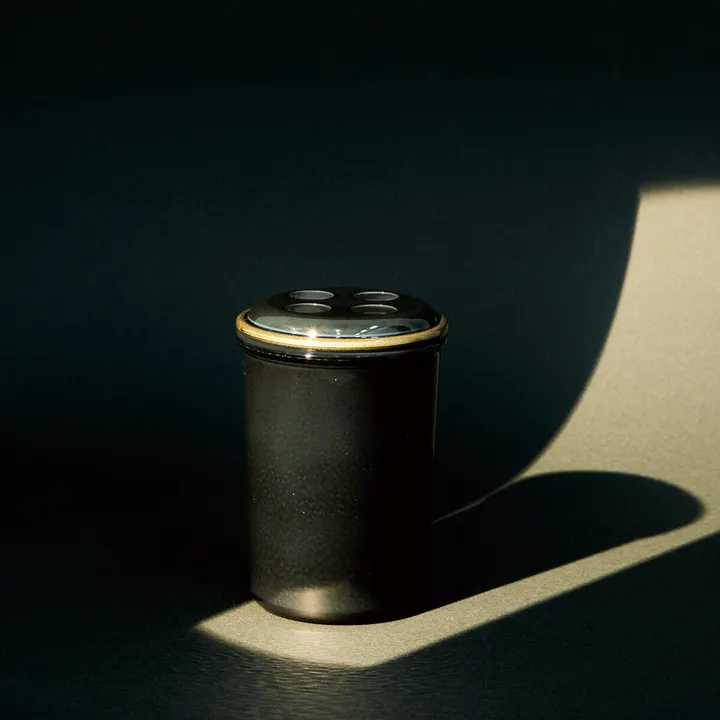 「Looks Like a POTTERY」 まるで陶器のような佇まいの樹脂製の歯ブラシホルダー。 陶器よりも軽く、割れにくいのが特徴です。 職人によりひとつひとつ丁寧に塗られ 機械では味わえない魅力を持ったアイテムです。 Cosmique Noir は「暗闇の銀河に漂う星屑」をイメージし、暗闇の中に星が散りばめられた小宇宙を表現しています。 リムに施されたゴールドリングがバスルームに上品さを与えてくれます。