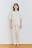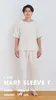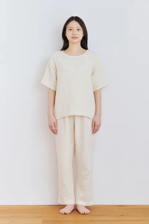 先行して展開していたルームパンツをご愛用の方々をはじめ、たくさんのご要望をいただいておりましたトップスが、ようやく発売となりました。 サラッとした着心地で、ふわふわの肌触りが地肌に気持ちよく、春夏のシーズンにぴったりです。 身幅と、袖丈、アームホールがやや大きめのつくりで、ざっくりとしたシルエットのデザインなので、体のラインを拾いません。 また、ネックホールは着脱時のストレスがない、ややゆったりめの仕様ですが、かがんだ姿勢でも開きすぎないつくりです。 着丈は(長袖に比べて)少し短いつくりになっています。 全工程日本製、ホルマリン検査済みで、敏感肌の方でも安心してお使いいただけます。 パジャマ、部屋着などルームウェアとして、そして、ちょっとそこまでお出かけするワンマイルウェアとして、くらしの中のいろんな場面で活躍してくれます。 部屋干しでも乾きやすいので、それほどたくさんの洗い替えも必要ありません。 いつもどおりのお洗濯方法で遠慮なく洗えます。 シワも気になりづらい生地なので、ぜひ気兼ねなくいろんなシーンでお使いください。 サイズはS、M、L、XLがあります。男女兼用となっています。身長やお好みのサイズ感に合わせてお選びください。
