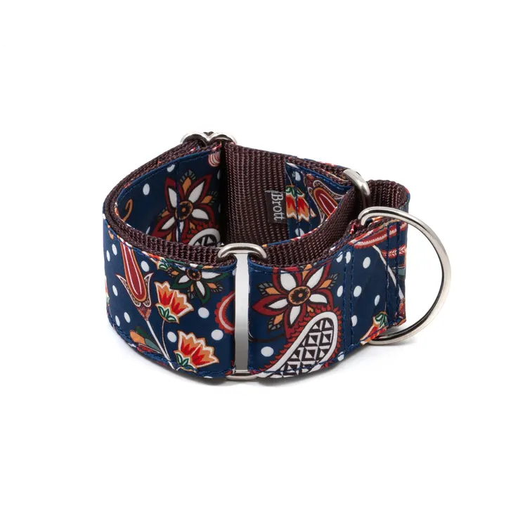 伝統的なマリンスタイルを超え独自のスタイルで愛犬に個性的な輝きを。 濃いブルーを基調としたデザインにペイズリー風の美しい模様が施されており、どんなシーンでも目を引く存在感を放ちます。 太陽の下での散歩や特別なイベントにぴったりの、華やかさを感じられるアイテムです。 ? マーチンゲールカラー 幅が4cm、5cmと通常よりも広め。頭と首が細長く通常の首輪では抜けてしまうハウンド犬種に、特にぴったりのハーフチョークタイプです。 ハウンド系犬種以外でも幅広くお使い頂けます。頭からかぶせて着用するので、頭のサイズも必ずご確認ください。 ? 素材 裏地:ポリエステル100%リボン(エコテックス認証取得)表地:ポリエステル100%?