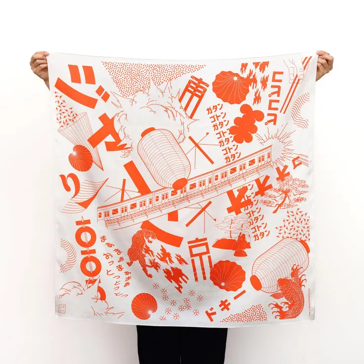 山手線をテーマに、様々なグラフィックを作り続けるユニークなデザインユニット " YamanoteYamanote" とのコラボレーションにより生まれた、"Tokyo" をテーマにした風呂敷の第3弾目のデザイン。 匂い、音、様々な形... 東京ならではのインスピレーションから生まれたグラフィックデザインの数々は、見ているだけで楽しい気持ちになるどこにもない風呂敷です。 鮮やかなオレンジがファッションのポイントになり、スカーフやバッグ、壁掛けのアート作品としても。 東京好きな海外の方へのギフトとしてもおすすめです。 上品さと、エッジの効いたアート作品の両方の要素を、900mmx900mm の風呂敷に表現したLinkならではの風呂敷です。 サイズ : 90x90cm 素材 : コットン 100% お洗濯可能 日本製