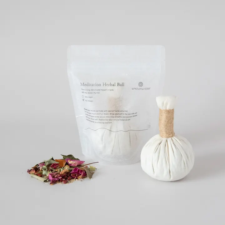 *メディテーションハーブボール 満月 FULL MOON* ―月のリズムにあわせて 自然と繋がる、私と繋がる― メディテーションハーブボールは、忙しい毎日の中で、自分に意識を向ける時間が取りづらいという方に、自分と対話し、自分と向き合う習慣を大切にしてほしいという想いを込めて作りました。新月と満月のテーマでブレンドした神聖なハーブボールの香りと温かさに包まれて、深呼吸とともに、自分の内側へと深く繋がっていきます。メディテーションハーブボールは、本当の自分を生きる喜びを取り戻し、豊かで幸せな人生を送りたいと願うあなたをサポートします。 【商品説明】 <満月> 心と体を解放し、高揚したエネルギーを鎮静・リラックスさせるハーブをブレンド。芳醇で神秘的な香りは、本当の自分を受容し、愛と幸福感で満たします。本来の輝きを取り戻して、より純度の高い「私」に還ります。 *ハーブボールとは? 何種類ものハーブを布に包み、温かく蒸したものを全身に押し当てるトリートメントです。ハーブの香りに包まれ、全身を芯から温めてくれる「ハーブのお灸」と言われています。タイやインドなどのアジア諸国を中心に、昔から伝統医療の一つとして治療で使われており、現在も病院で薬として提供されています。ハーブボールの柔らかさと温かさ、そして香りは心と体を芯まで温め、深いリラックスへと導くと言われています。