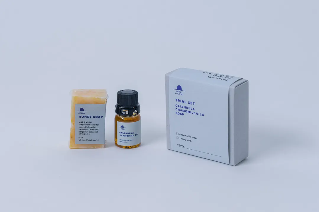 はじめて SORRY KOUBOU のケアをお試しいただく方に人気の、 石鹸と保湿オイルのミニサイズを組み合わせたトライアルセット です。 石鹸は、お肌にやさしい泡で洗いあげる 「カモミール石鹸」または「はちみつ石鹸」 のどちらかが入ります。 どちらも自社農園の植物を使い、合成香料・合成着色料不使用。 敏感肌の方にも安心しておすすめいただけます。 セットのオイルは、リピート率の高い 「カレンデュラ・カモミールオイル(ミニ)」。 乾燥・ゆらぎやすいお肌にしっとりとしたうるおいを与える人気商品で、 お顔の保湿はもちろん、目元・口元など部分的なケアにも使える万能タイプです。 • 石鹸:1個(約1ヶ月分)お顔・身体に使用可 • オイル:5ml(約2週間分/お顔のみ) 持ち運びやすいサイズで、 旅行のお供やギフト、初めての方向けの導入アイテムとしても人気 があります。 ⸻ ■ カモミール石鹸 肌への刺激となる不純物を残さないよう、 昔ながらの釜だき製法で、ひとつひとつ手作業で仕上げています。 炎症やアレルギーを抑える作用があるとされる ジャーマンカモミールをたっぷり練り込み、 敏感な肌でも使いやすいやさしい処方にしました。 やわらかく立ち上がる泡と、ほのかなハーブの香り。 泡立てネットをご使用いただくと、よりきめ細かな泡立ちを楽しめます。 ✔ 敏感肌・乾燥肌・ゆらぎ肌の方に人気 ✔ 贈り物としても選ばれやすい “やさしい使い心地” ✔ 子どもにも使いやすい穏やかな処方 ⸻ ■ はちみつ石鹸 こちらも同じく、 肌への負担となる不純物をなくすため 釜だき製法で丁寧に製造しています。 ダメージを受けた肌を整えると言われる カレンデュラと、 高い保湿力を持つ 下川町産はちみつを練り込んだ、 しっとりタイプの石鹸です。 甘くやさしい香りで、特に冬場に人気。 泡立てネットのご使用でよりクリーミーな泡立ちに。 ✔ 乾燥肌の方に特におすすめ ✔ 冬場の需要が高い ✔ 保湿力重視の顧客層に ⸻ 客層について SORRY KOUBOUのスキンケアは、 30代〜60代の女性を中心に安定した支持をいただいています。 とくにナチュラル志向・敏感肌ケア・植物由来の香りを好まれる方に選ばれています。 ⸻ ブランドについて SORRY KOUBOUは北海道・下川町の小さな工房から生まれたブランドです。 無農薬・有機肥料で育てたハーブを自ら栽培し、 栽培・抽出・製造・梱包まで一貫して手がけています。 私たちは、植物の色や香りも有効成分の一部 と考え、 収穫から1年以内の、力強く色鮮やかなハーブのみを使用しています。 その時々の畑のコンディションが、そのまま製品の表情になるような、 “生きた植物の力” をできる限りそのままお届けしたいと考えています。