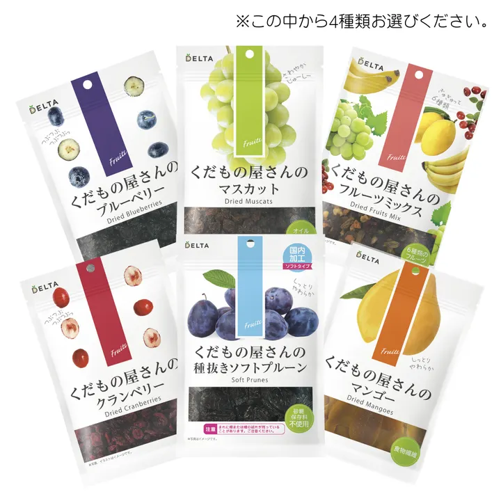 デルタインターナショナルのロングセラー商品である「くだもの屋さん」シリーズ。 ※6種類の中からお好きなものを4種類選んでください。 ●デルタの「くだもの屋さん・ナッツ屋さん」シリーズ● 地球のために、あなたのために、わたしたちはできることからはじめます。 ◎リサイクルペット素材:パッケージにリサイクルペットを使用(認証マーク入り)。新しいプラスチックを生み出すことなく、端材を無駄なく使用。(注:プルーン、マンゴーは通常のPET素材使用。) ◎環境配慮型インキ:バイオマスインキ使用。インキは石油由来のものを減らし、被子植物の種から抽出した植物由来のものを使用することによりバイオマス度10%以上を確保。(認証マーク入り)