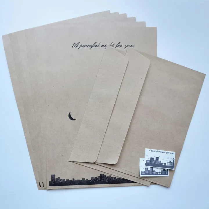夜の街をイメージした、よるまちレターセットは、受け取った人が穏やかで幸せな夜を過ごせるように、との思いをデザインに込めました。便箋の上部にはタイトルが、下部には月や建物のシルエットが描かれており、まるで夜の街を散歩しているかのような気分にさせてくれます。 便箋と封筒は手触りの良いクラフト紙を使用し、一目でその特別感を感じていただけることでしょう。受け取る方に心の余裕やリラックスを与えることができます。 手書きの手紙は相手に温かい思いやりを伝える一つの方法です。大切な人への感謝や励ましの言葉をこの、よるまちレターセットで贈りませんか?自分へのご褒美にもおすすめです。ちょっとした手紙やメモも、より特別なものに変えてくれますよ。 ぜひこの夜の街への散歩を楽しんでください。 当店は夜の街をテーマにした様々なハンドメイド雑貨を販売しています。 夜の街は、色とりどりのネオンや星空、月明かりなど、美しい光に満ちています。 私たちはその風景を雑貨に取り入れて、お客様のお部屋に夜の街の雰囲気を届けたいと思っています。また、夜の街は、静かで落ち着いた時間や、楽しくワクワクする時間など、様々な表情を見せてくれます。当ショップではその表情を雑貨に反映させて、お客様の気分に合わせて使えるように工夫しています。 当ショップは全ての商品のデザインに「穏やかな夜を過ごせますように」という思いを込めています。ぜひ、私たちの雑貨をご覧ください。夜の街の魅力を感じていただけると嬉しいです。 【ショップの始まり】 “きっかけ”は子どもたちとのワクワク感 児童施設で働いていた際、運営のための工作が毎日のように行われていました。シンプルな紙工作や粘土、プラ板などに喜ぶ子どもたち。素人の手作り品質の工作でも純粋に楽しむ子どもたちの笑顔を見ていると自分も嬉しくなりました。それをキッカケに、ものづくりに興味が湧き、何かを作ることで人を喜ばせることができる活動をしたいと思うようになりました。何かできないかと模索していたところ、運良く良いメンターに出逢うことができ、雑貨製作の発想から手順など集中的に教えていただきました。その後、雑貨クリエイターとして活動を開始。 自分は夜景を見るのが好きです。街灯りのひとつひとつに、そこに住む人々のドラマがあるように感じ、それを想像してワクワクします。そのワクワク感を日常でも感じることができたら良いなと思い、夜景雑貨を製作することを決めました。 日常のふとした瞬間、部屋の片隅に煌々と街灯りが見える・・そんな楽しい雑貨を、多くの人に感じてもらえたらと思います。 街灯りの数だけある人々のドラマも演出 夜景の魅力は、美しい煌々とした灯りを眺めるだけではなく、その灯りの下に展開しているであろう人々のドラマを想像することも、楽しむ要素のひとつだと思います。 アパートやマンション、一戸建て住宅やカフェ、交番やパン屋など、なにげない街の建物が夜になると灯りをともし煌々としてきます。その姿を文具や雑貨にデザイン。またそこに住む住人たちのシルエットが映ることで、鑑賞に深みが増しオブジェとしてのクオリティも高まります。 もちろん商品は、見るだけでなく実用的にも使用できるよう工夫されています。 <レターセット 商品内容> 封筒 2枚(洋2型) 便箋 6枚 ミニシール 2枚
