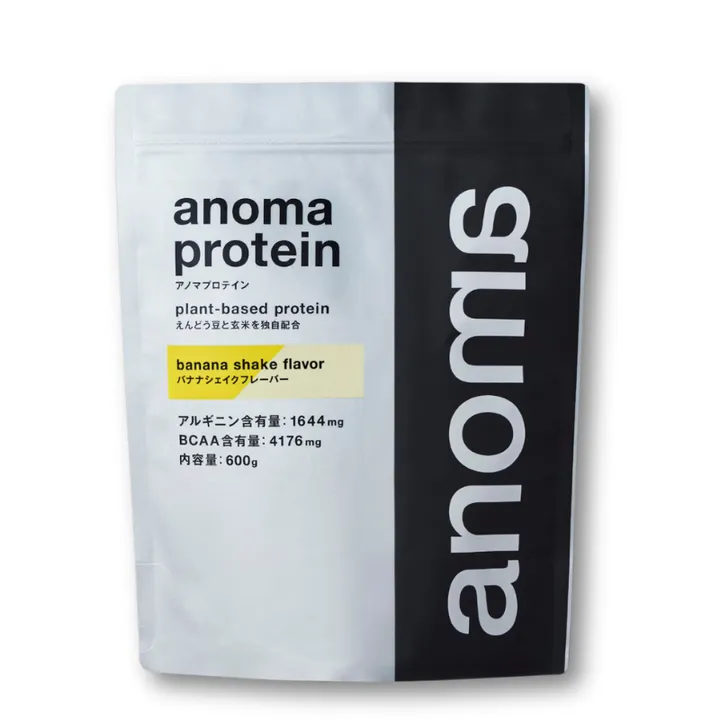エクアドル産バナナの純度100%パウダーを使用した、バナナ本来の芳醇な香りとスッキリとした甘味が楽しめるフレーバー。 「自然な甘さとおいしさ」 anoma独自の技術で、人工甘味料や砂糖を使わずに天然甘味料のみで自然な甘さとカラダへの優しさを実現。 本格素材の味付けで、プロテインなのに毎日飲めるおいしさを実現しました。 「アスリートも使う高機能 BCAA4000mg、アルギニン1500mg以上配合」 ピープロテインと玄米プロテインの独自比率配合により、1食30gあたりタンパク質20g以上を実現。 必須アミノ酸BCAAやアルギニンの高配合とエネルギー変換率の高いMCTオイルも配合。ハードなトレーニングを行うアスリートの仕様にも耐えうる高機能な商品です。 「安全性にこだわった原材料」 anomaは、アレルギーリスクが最も少ないとされるえんどう豆を使用し、さらに遺伝子組み換えリスクが最も低いとされる欧州産えんどう豆に厳選。 玄米タンパクも除草剤が使用されていないものを使用。 安全性にも徹底的にこだわりました。 また従来のプロテインに使用が多い人工甘味料、保存料、着色料、乳化剤は一切使用していません。 「環境負荷の低い粉末栄養食」 ピープロテインは動物性のタンパク質で作られるプロテインと比較して、より少ない土地や水の使用量で生産することが可能です。私たちは「持続可能な食を提供する」というミッションのもと、国連の定めるSDGsの考えに賛同し、より環境負荷の少ない粉末栄養食を開発しています。