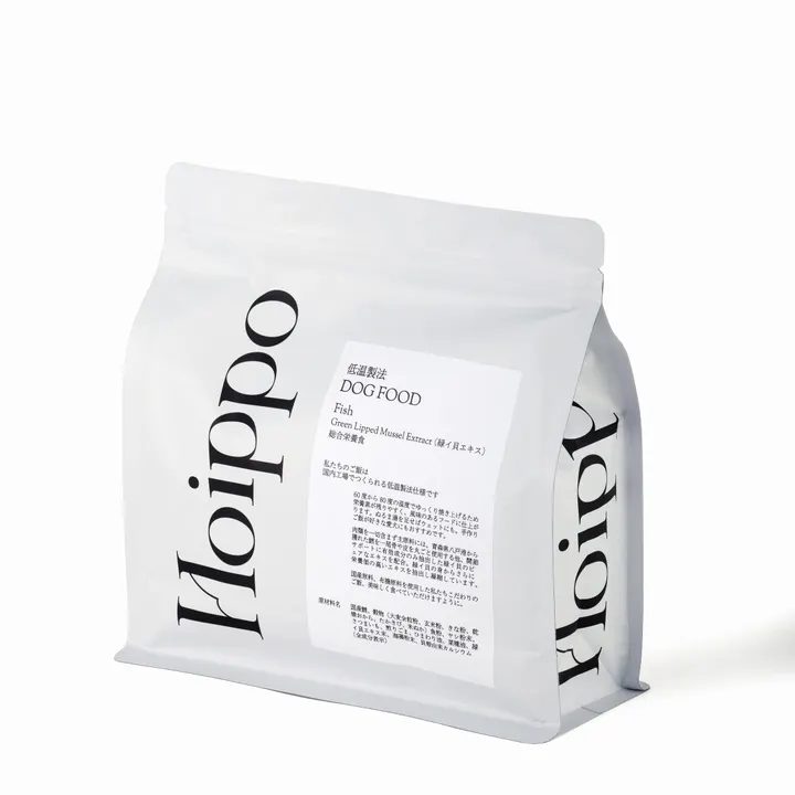 Hoippoのドッグフードシリーズ、本製品は肉類を一切含みません。 主原料には国内の漁港で採れる旬の魚を使用し、フードの50%以上含み食べ応え抜群。一尾骨や皮も丸ごと含みます。 本製品に採用した「緑イ貝エキス」は、関節サポートに有効成分のみ抽出した緑イ貝のピュアなエキスを配合。緑イ貝の身からさらに栄養価の高いエキスを抽出し凝縮しています。 また低温製法仕様は、通常120度ほどで焼き上げる製法に比べ、60度から80度の温度でゆっくり焼き上げるため栄養素が残りやすく、風味のあるフードに。独自の製法を用いることにより、強化剤を含まず総合栄養食の基準を満たした仕上がりになっています。 手作りご飯のお供に、カリカリが苦手なわんちゃんにもおすすめです。 ぬるま湯をかければウェット仕様に。幼犬から老犬まで安心して食べていただけます。 なるべく隙間なくフードが入るように改良したコンパクトな800gサイズは、置き場所にも困りません。 外出先でも持参いただけるお試しサイズの50gもご用意しております。 商品のポイント 1. 低温製法で自然風味や栄養素が残りやすい 2. 旬の魚丸ごと一尾使用 3. 総合栄養食 4. 肉類不使用(お肉が食べられない愛犬にもおすすめです) 5. 国内工場で製造 一日の標準給与量目安(成犬) 超小型犬 1kg~5kg・30g~103g 小型犬  5kg~10kg・103g ~172g 中型犬  10kg~20kg・172g~289g 成分保証分析値 340kcal(100g) 粗たんぱく質28%以上、粗脂肪10%以上、粗繊維4%以下、粗灰分7%以下、水分10%以下