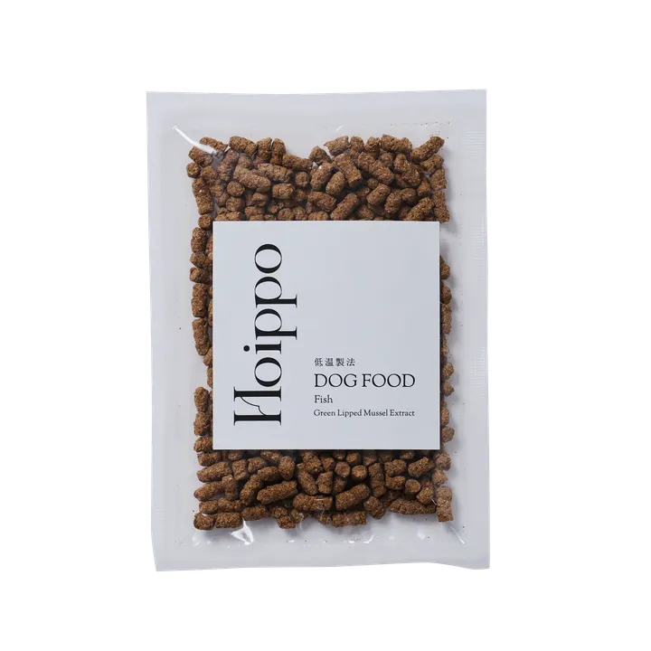 Hoippoのドッグフードシリーズ、本製品は肉類を一切含みません。 主原料には国内の漁港で採れる旬の魚を使用し、フードの50%以上含み食べ応え抜群。一尾骨や皮も丸ごと含みます。 本製品に採用した「緑イ貝エキス」は、関節サポートに有効成分のみ抽出した緑イ貝のピュアなエキスを配合。緑イ貝の身からさらに栄養価の高いエキスを抽出し凝縮しています。 また低温製法仕様は、通常120度ほどで焼き上げる製法に比べ、60度から80度の温度でゆっくり焼き上げるため栄養素が残りやすく、風味のあるフードに。独自の製法を用いることにより、強化剤を含まず総合栄養食の基準を満たした仕上がりになっています。 手作りご飯のお供に、カリカリが苦手なわんちゃんにもおすすめです。 外出先でも持参いただけるお試しサイズの50g、通常サイズは500g、1kgの3種類をご用意。 ぬるま湯をかければウェット仕様に。幼犬から老犬まで安心して食べていただけます。 商品のポイント 1. 低温製法で自然風味や栄養素が残りやすい 2. 旬の魚丸ごと一尾使用 3. 総合栄養食 4. 肉類不使用(お肉が食べられない愛犬にもおすすめです) 5. 国内工場で製造 一日の標準給与量目安(成犬) 超小型犬 1kg~5kg・30g~103g 小型犬  5kg~10kg・103g ~172g 中型犬  10kg~20kg・172g~289g 成分保証分析値 340kcal(100g) 粗たんぱく質28%以上、粗脂肪10%以上、粗繊維4%以下、粗灰分7%以下、水分10%以下