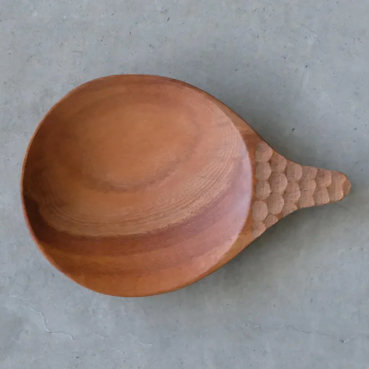 スプーンのようにも、お皿のようにも見える、遊び心のあるデザイン。 ちょっとした一品をのせたり、持ち手があるので取り皿としても活躍しそうです。 ベンガル地方では馴染み深いマスタードオイルで仕上げています。 インドのコルカタから車で3時間の山奥にニームカトラリ―の生産者の村があります。 「ミラクルニーム」とも呼ばれるとても薬効の高い木で作ってもらった食器は、 ナチュラルな風合いで食卓に温かみをそえてくれます。 フェアトレードNGO・サシャと提携したフェアトレード商品です。