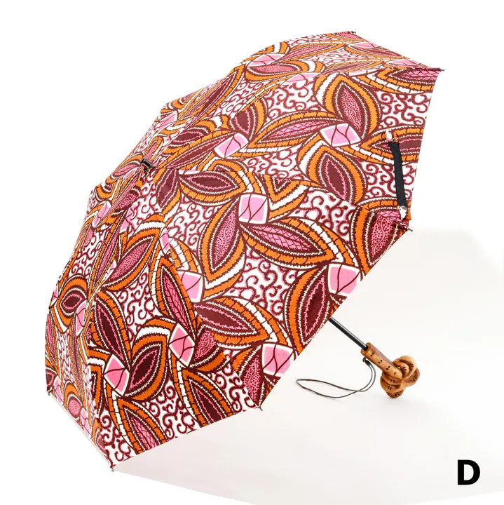 西アフリカのアフリカンプリント生地に国内で撥水、UV加工を施した晴雨兼用折りたたみパラソルです ハンドルは国内の木彫家が楠木を彫刻し着彩しています プリント生地はローカルマーケットから仕入れたものなので同じ柄は沢山は作れません(柄違いはあります) 紐のループがついていて手にかけられます チャームポイントはバッグから覗くヤシの木で、コミュニケーションツールともなります 1年中明るく楽しい気分でファッションを盛り上げます